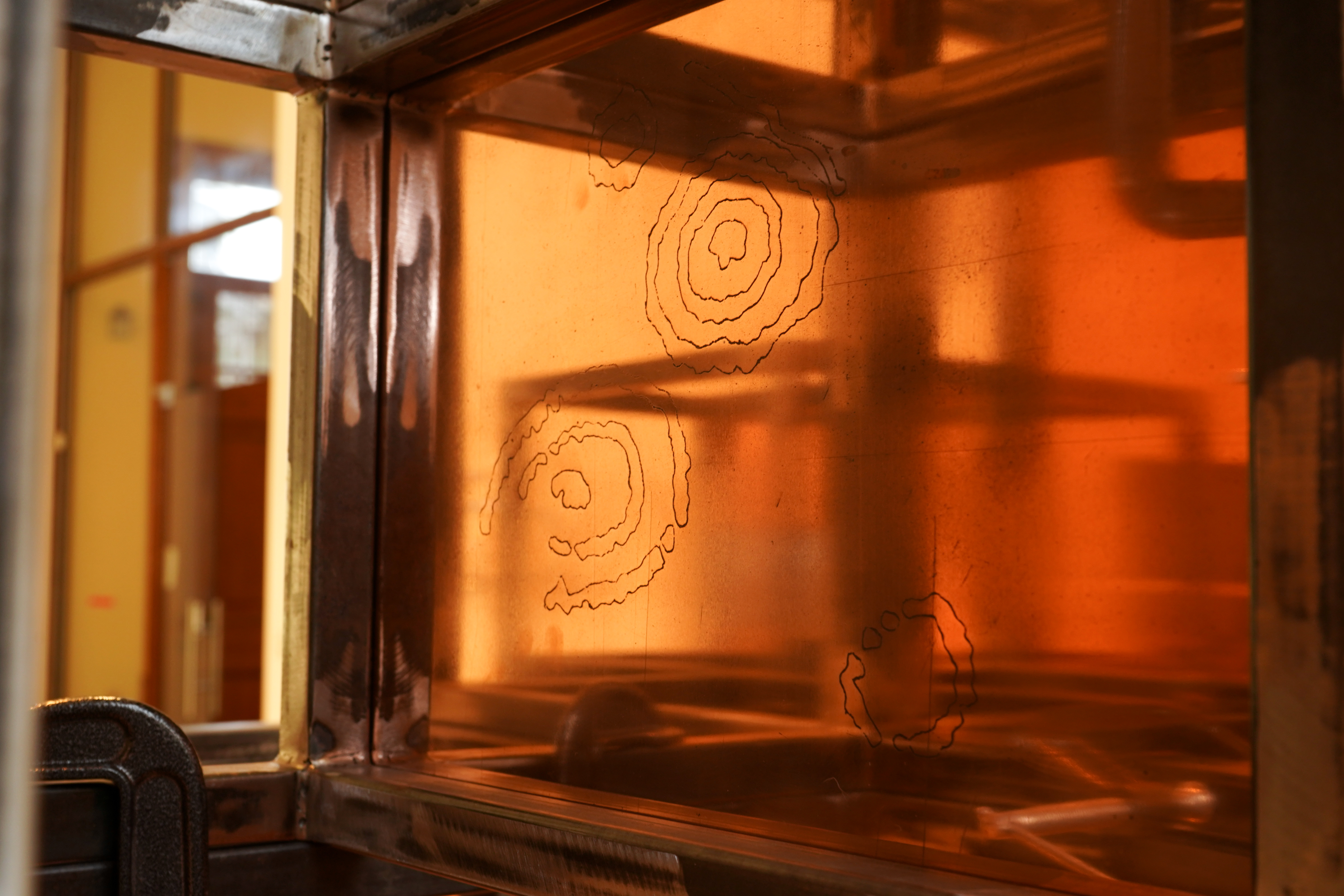 Modular sculpture that present a serie of empty boxes, that on its copper plates surfaces are etched precolombus petroglyphs missed in El mauro area, devastated by Los pelambres mining company.